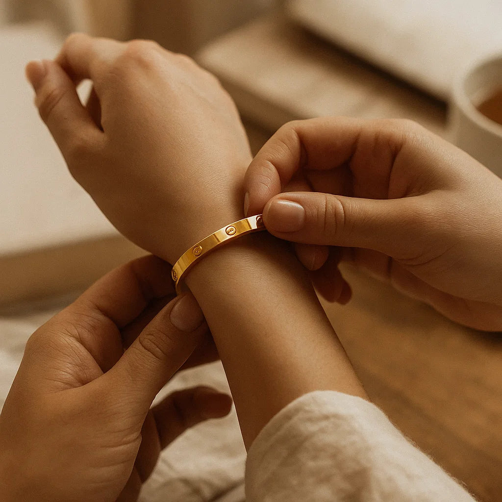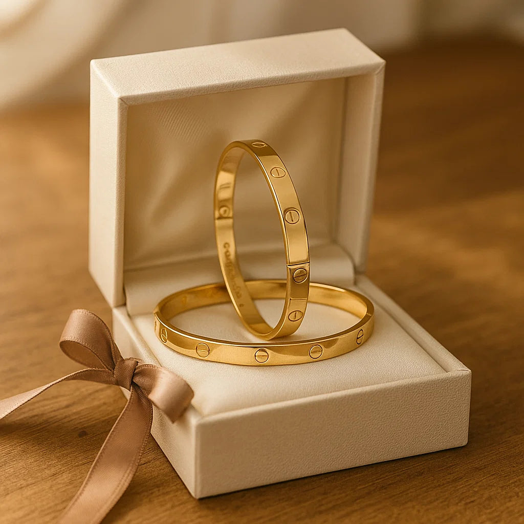 Narukvica od medicinskog čelika sa zlatnom pozlatom – Trajna kao osjećaji koji ne prolaze. Zatvara se šarafićem – simbol povjerenja i prave povezanosti. Unisex model – savršena za NJU, za NJEGA, za VAS. Diskretna elegancija s dubokom porukom ljubavi.